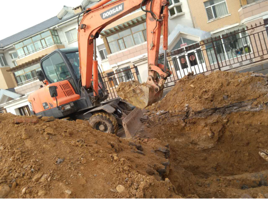 時(shí)間已到第三天上午,再次與業(yè)委會(huì)溝通,租用挖機(jī)挖溝,深度大概達(dá)到2.6米后,找到了管道漏水位置,連夜開始排水(將水泵管放置在地坑里將水抽出),請來專業(yè)焊工將腐爛供熱管截掉,然后焊接新管。